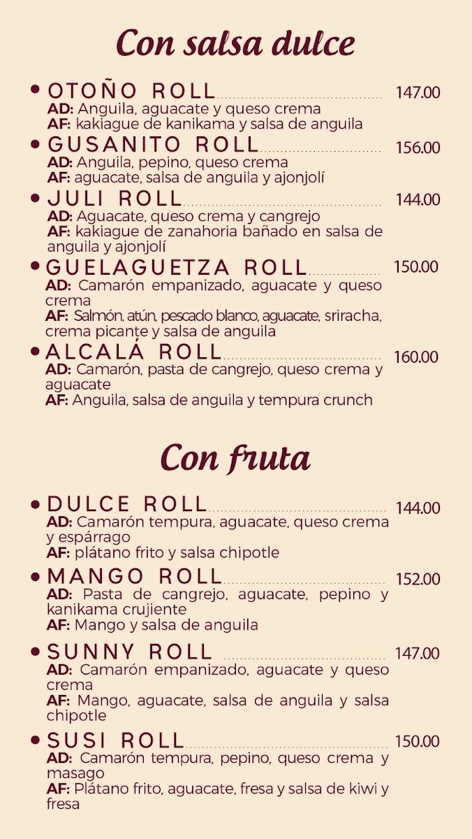 Rollo con camarón tempura, pepino, queso crema y masago, plátano frito, aguacate, fresa y salsa de kiwi, 8 pz.