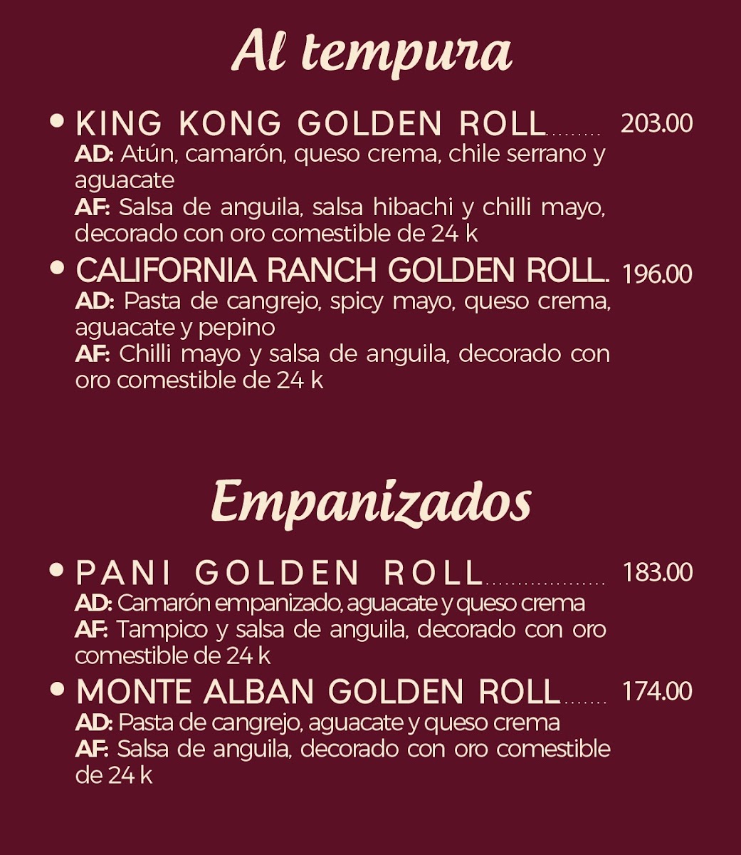 Rollo con camarón, pasta de cangrejo, queso crema,aguacate, anguila, tempura crunch y salsa dulce,decorado con oro comestible de 24 k, 8 pz.