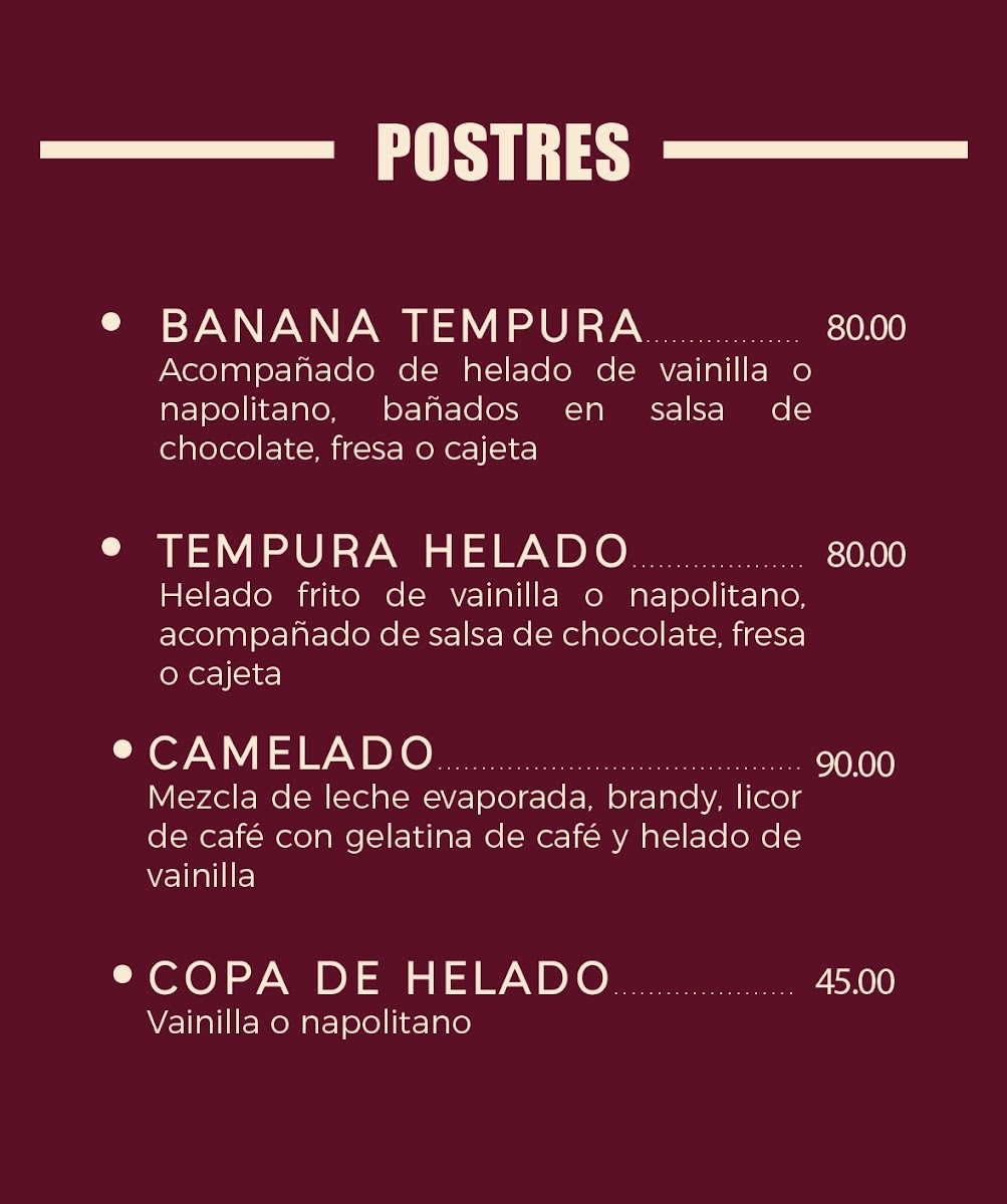 Banana en tempura, acompañada de helado de vainilla, bañados en salsa de fresa, mangoy cajeta, porción pequeña.